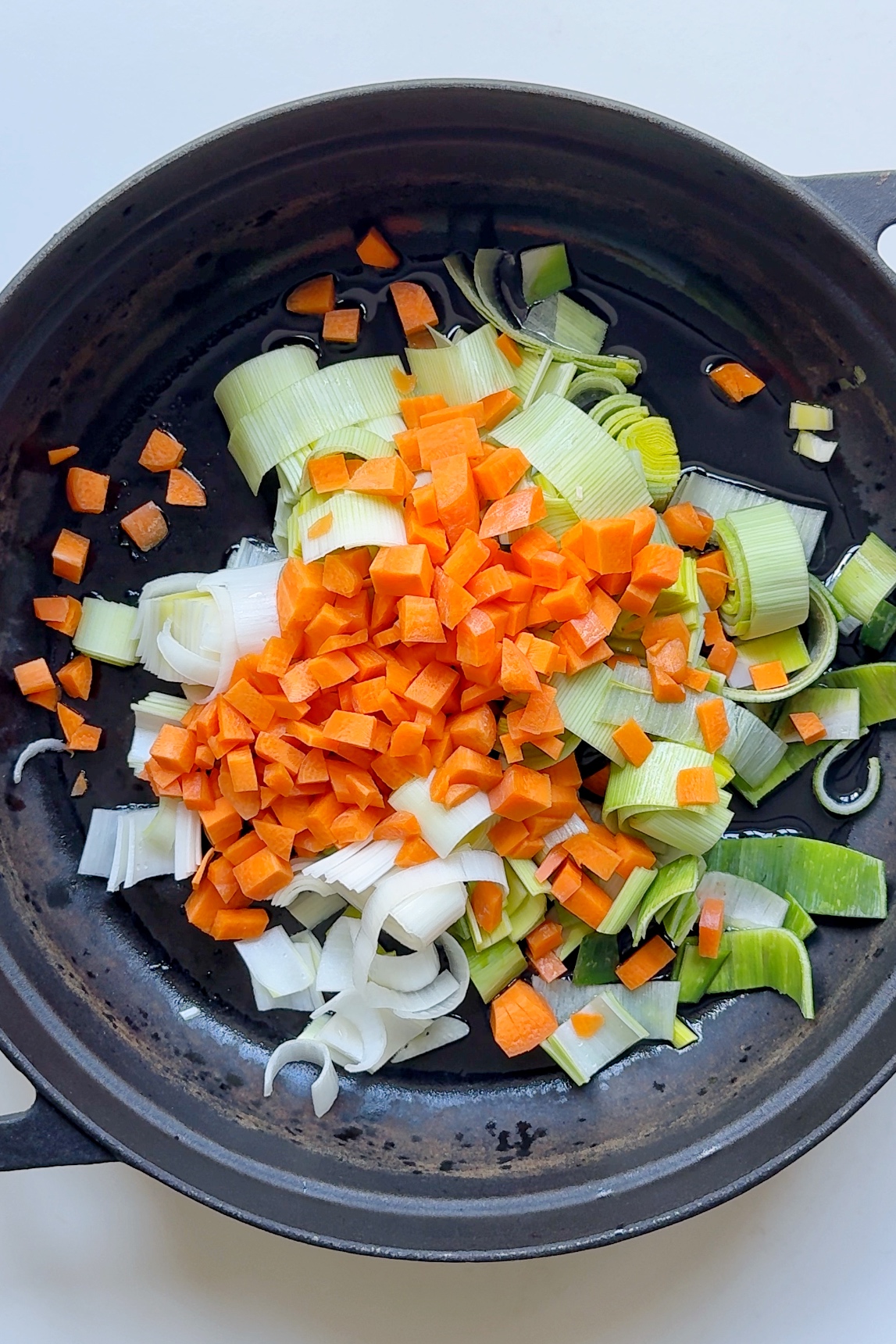 - Place an oven-proof pan on medium heat and drizzle with olive oil. Add in the minced garlic, sliced leeks, and carrot. Fry for a few minutes until softened slightly.